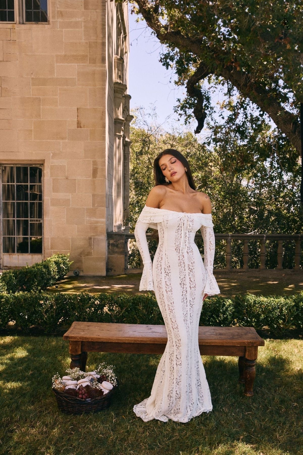 - Design: Schulterfreies, bodenlanges Kleid mit aufwendigen Spitzenmustern. Die langen Ärmel weiten sich zu eleganten Trompeten-Cuffs auf. Der obere Teil ist gerafft und mit einem Band in der Mitte versehen, um einen schmeichelhaften, femininen Effekt zu erzeugen