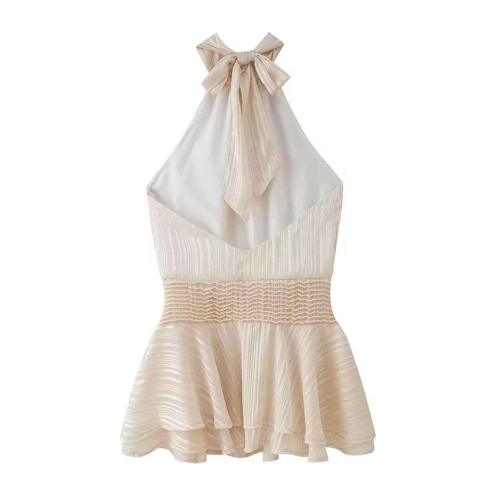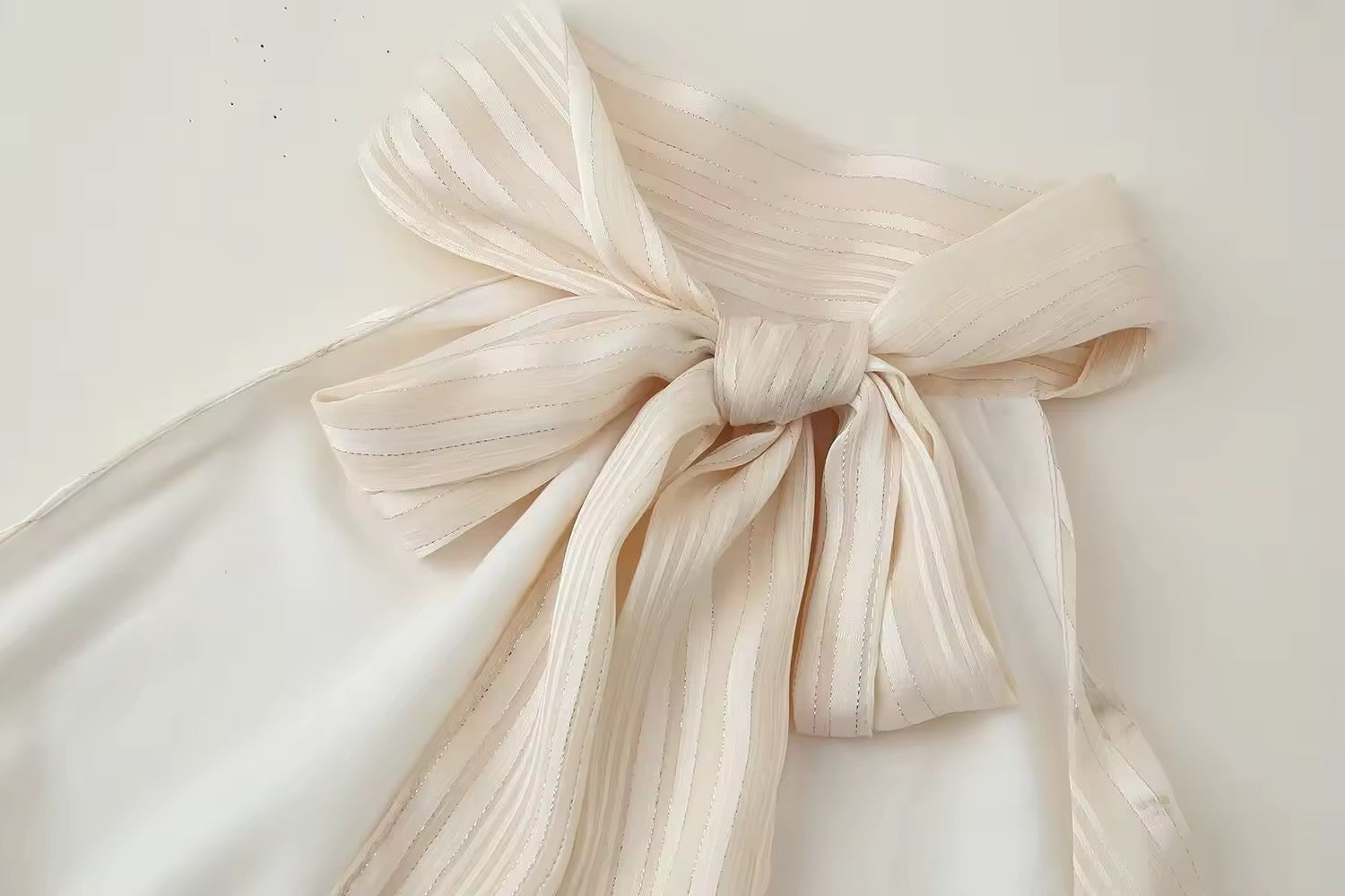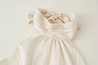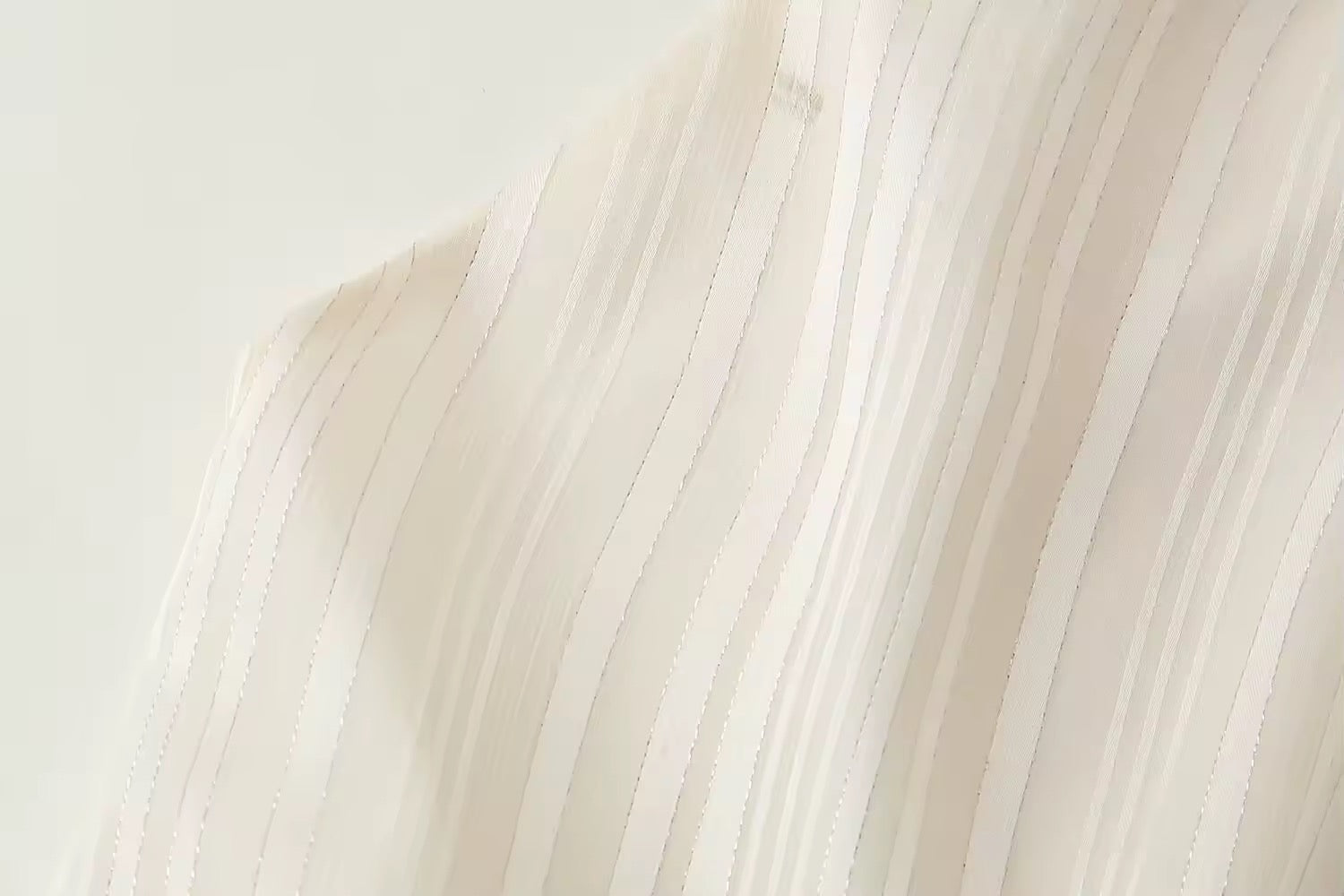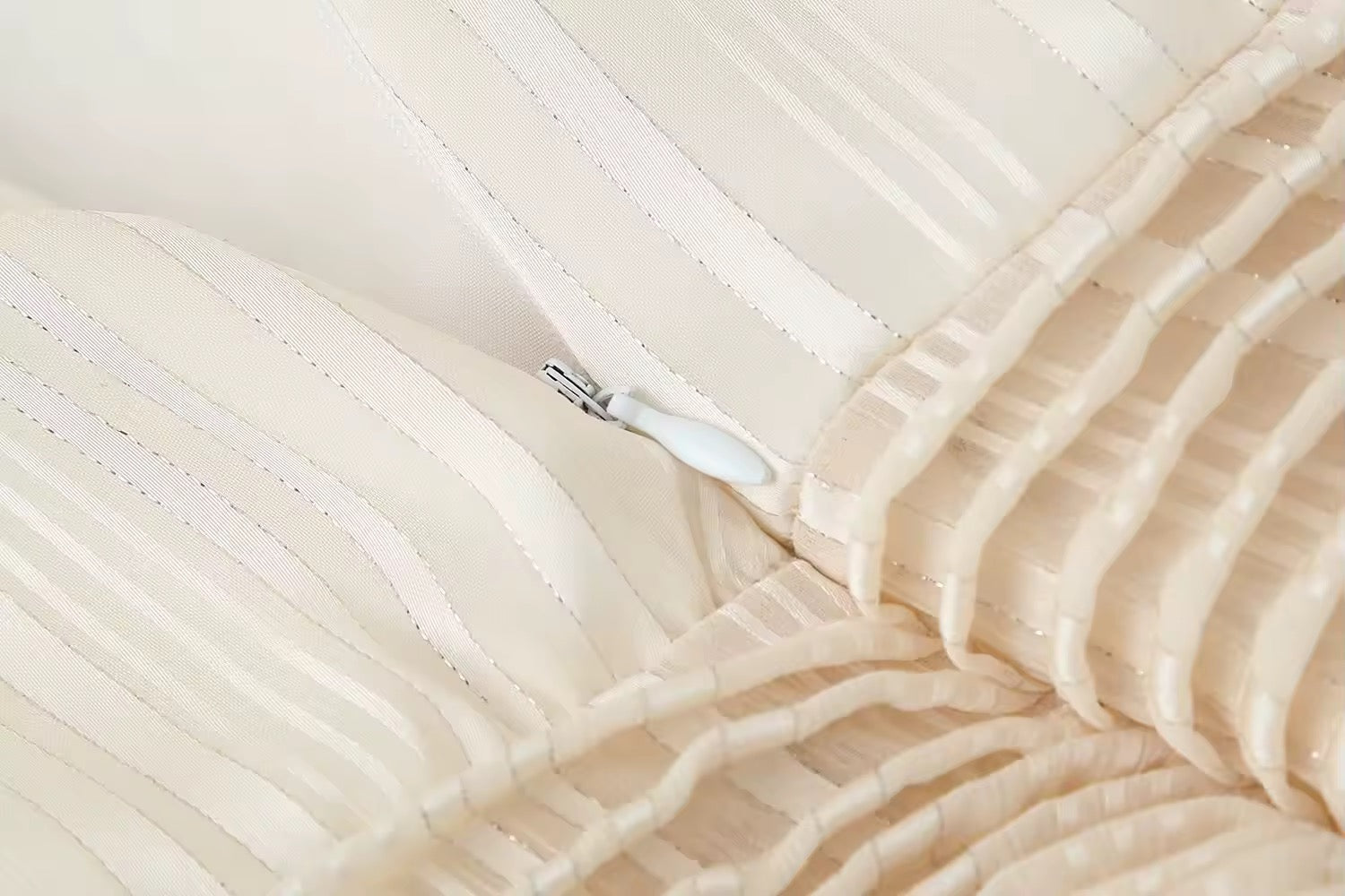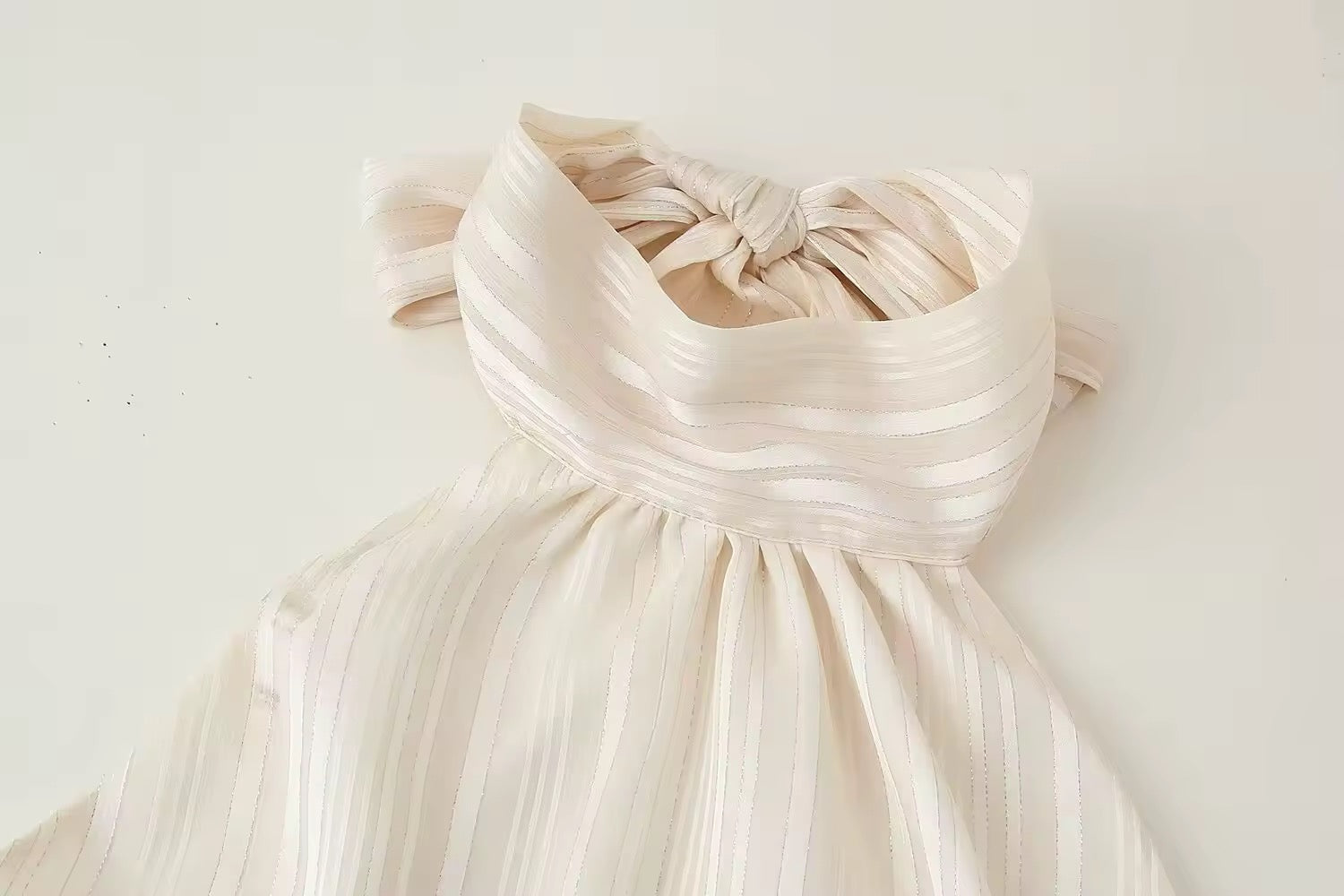 Dieses Kleid vereint Eleganz und Verspieltheit in einem wunderbaren Design. Die zarte, cremefarbene Farbpalette mit subtilem Streifenmuster lässt dich strahlen, egal ob auf einer Gartenparty oder beim romantischen Dinner. Der hochgeschlossene Schnitt und der fließende Rock umspielen sanft deine Silhouette und verleihen dir einen anmutigen Look.